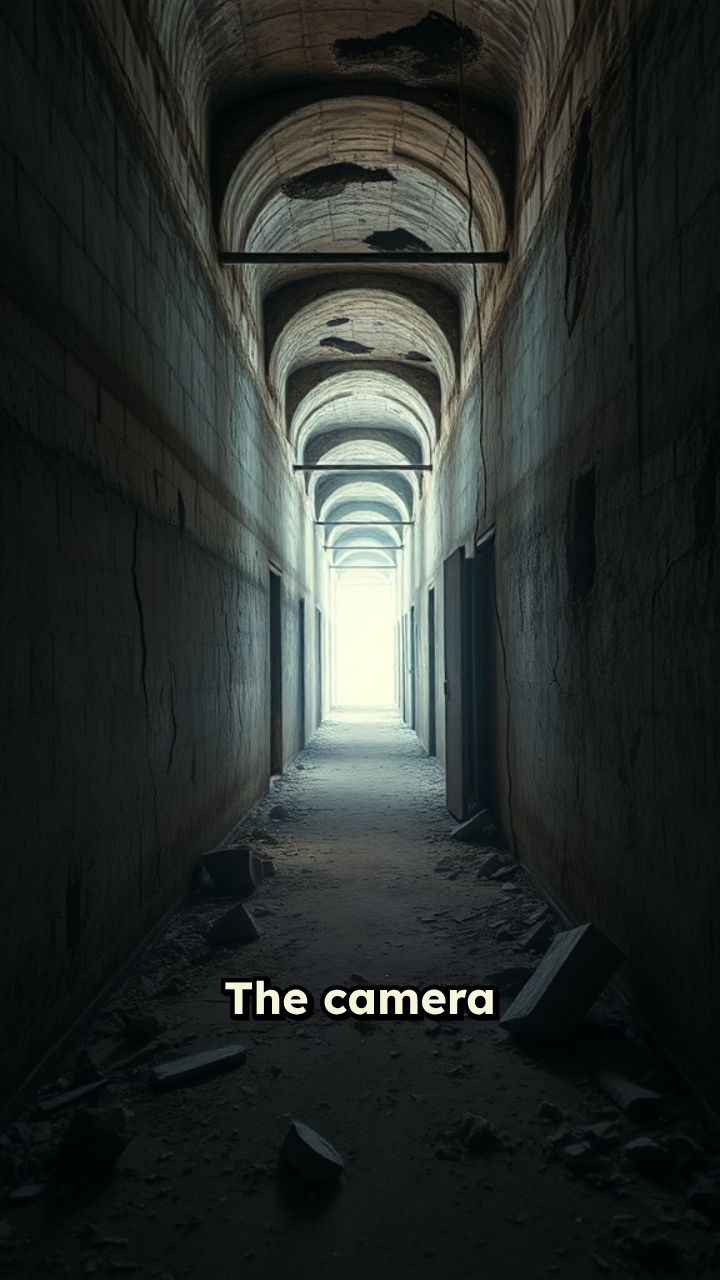 The camera moves slowly through a dusty hallway