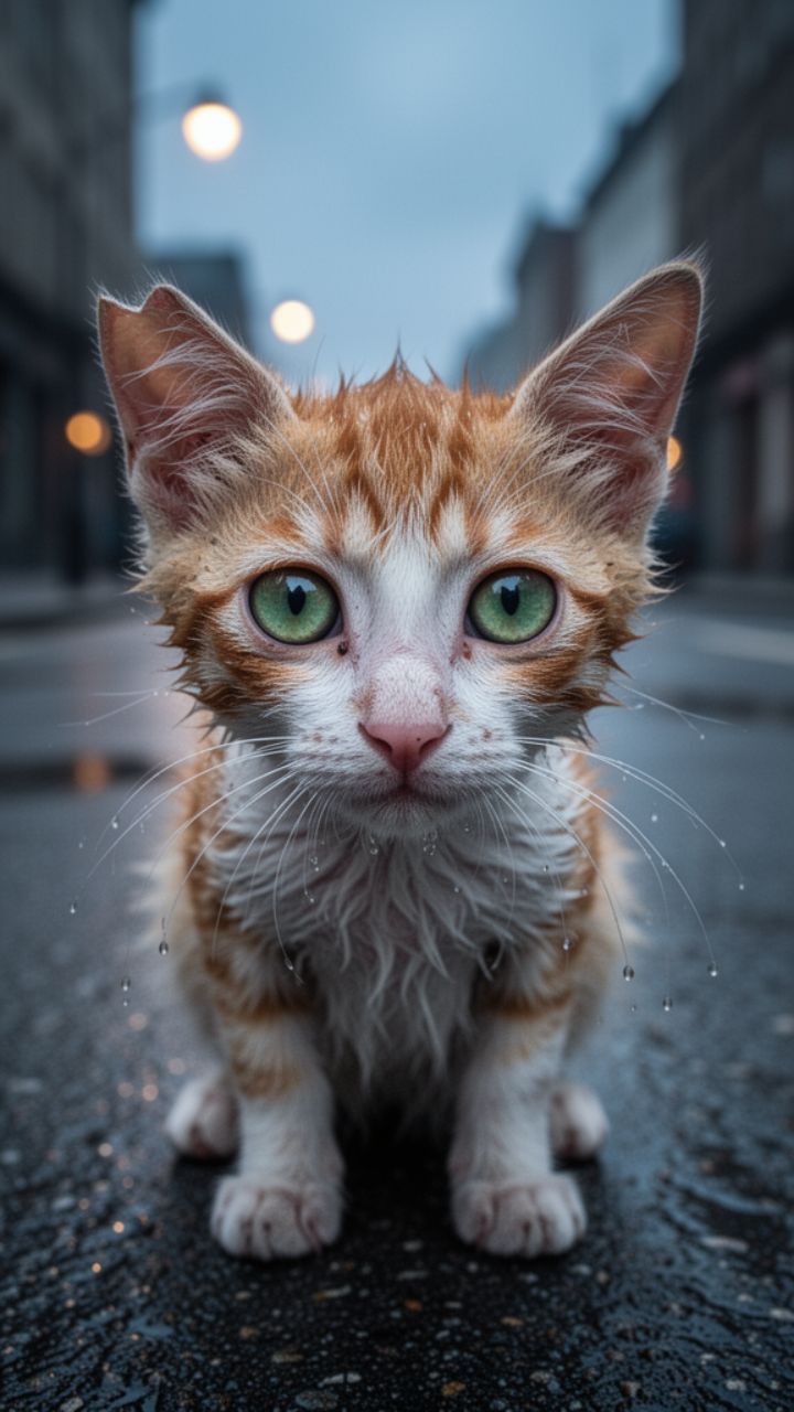 Маленькая кошка была голодной и одинокой. Её дом был холодным, дождь скапливался
