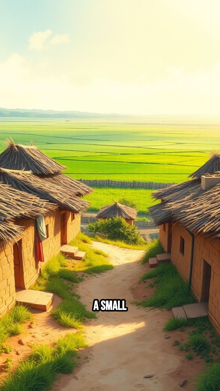A small Indian village, mud houses, green fields,
