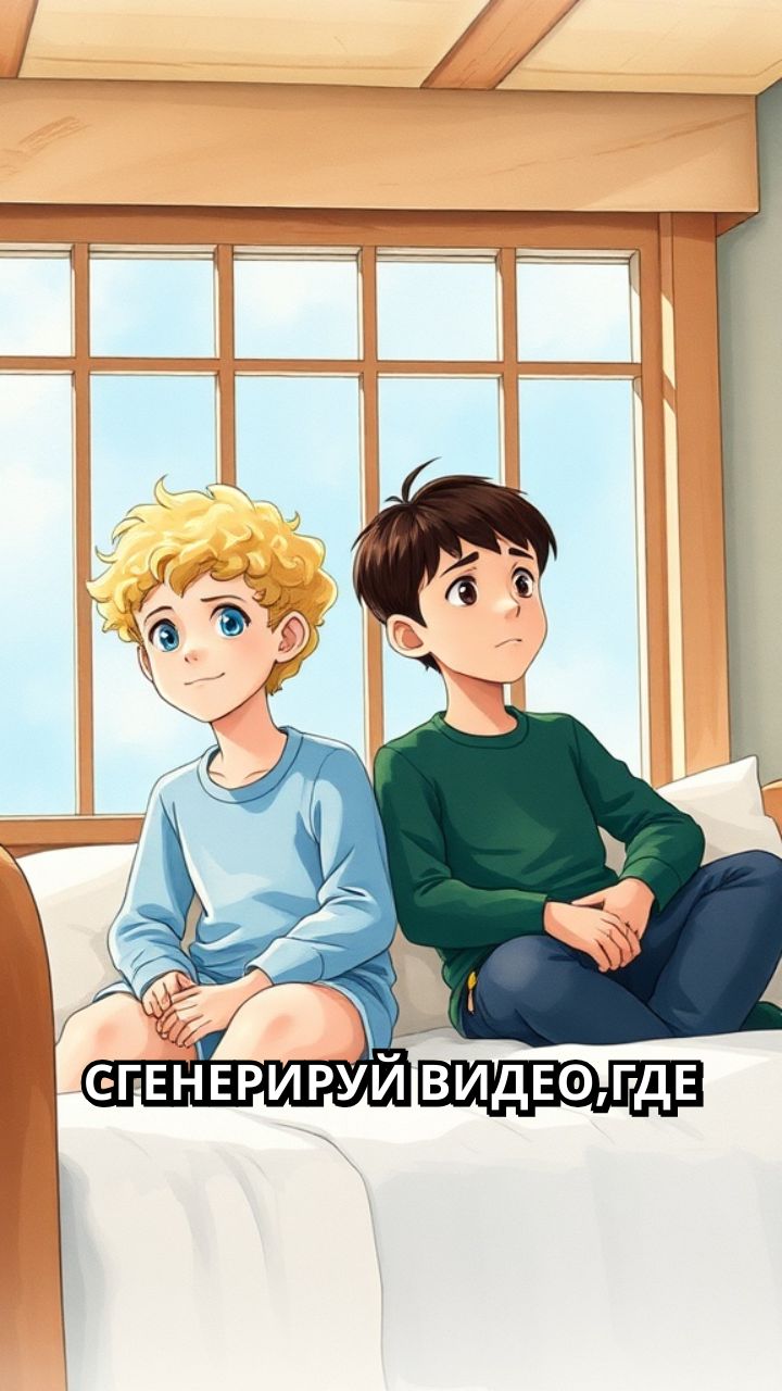 сгенерируй видео,где два мальчика сидят на лежанке,которая качается и смотрят в окно.