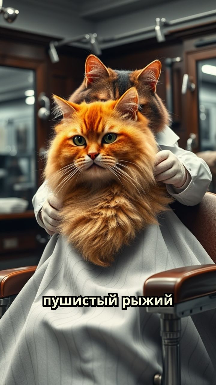 пушистый рыжий кот с черными волосами с бородой стрижет пушистого рыжего кота