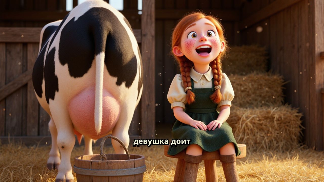 девушка доит корову и поёт