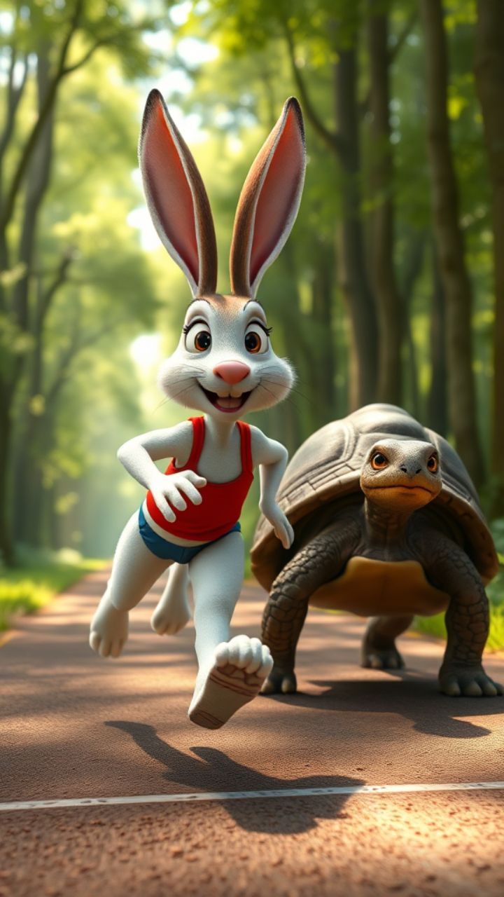 एक दिन खरगोश ने कछुए को दौड़ में चुनौती दी। दौड़ शुरू हुई। खरगोश तेज दौड़ा,
