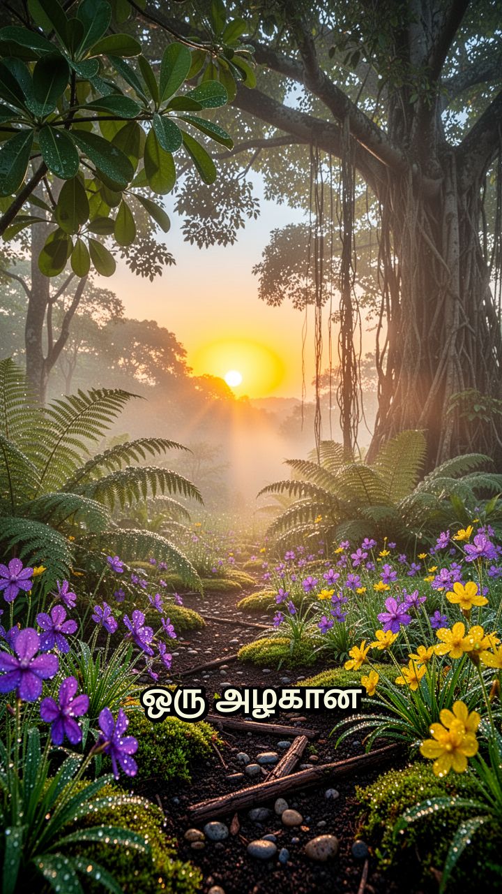 ஒரு அழகான காலை நேரம். பச்சை மரங்களும் பறவைகளும் சூழ்ந்த