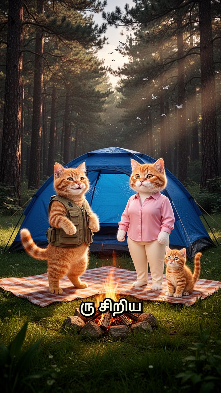 ரு சிறிய பூனை குடும்பம் அடர்ந்த காடினருகே மகிழ்ச்சியாக