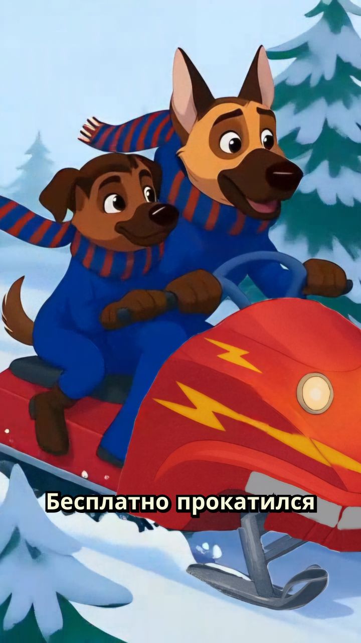 Два пса в синих комбинезонах мчались на красном снегоходе между елями,