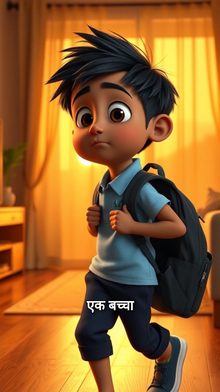 एक बच्चा स्कूल से थका-हारा घर आता है ।