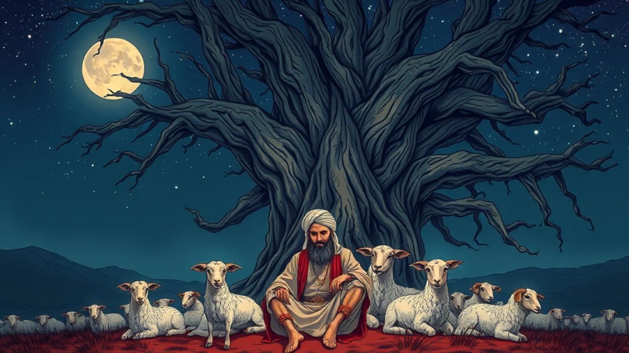 रात के वक्त जब वह एक दरख्त के नीचे बैठा, भेड़ें उसके इर्द गिर्द सुकून से चुरती