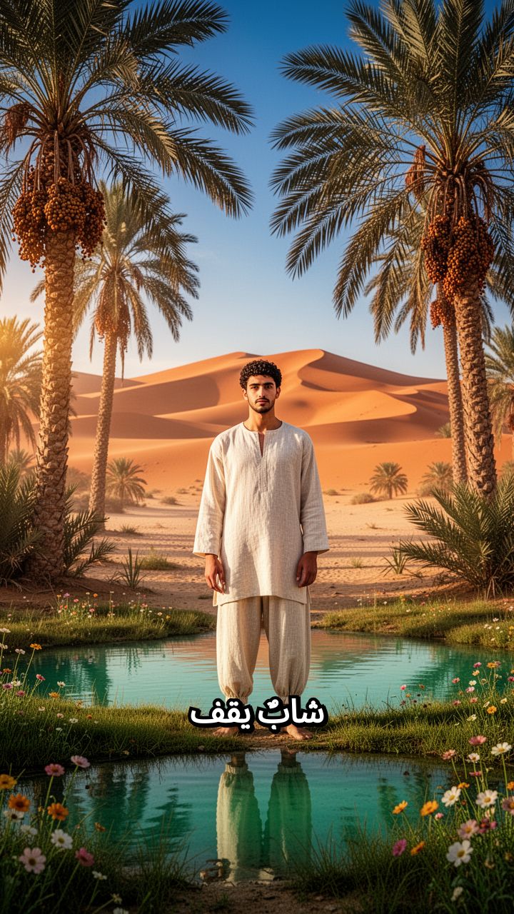 شابٌ يقف في واحةٍ وسط الصحراء. عيناه مغطّاتان بقطعة قماشٍ