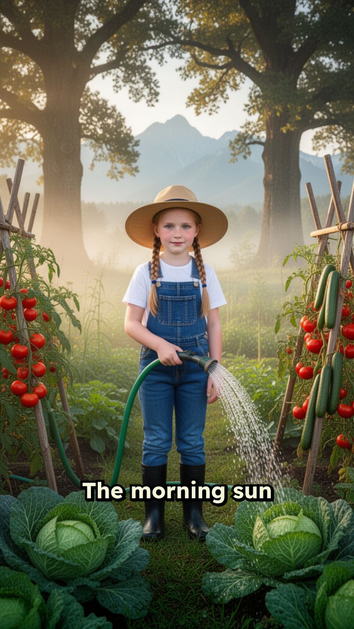 Lily carefully waters her vibrant vegetables, from crisp cabbages to bright red bell peppers.
