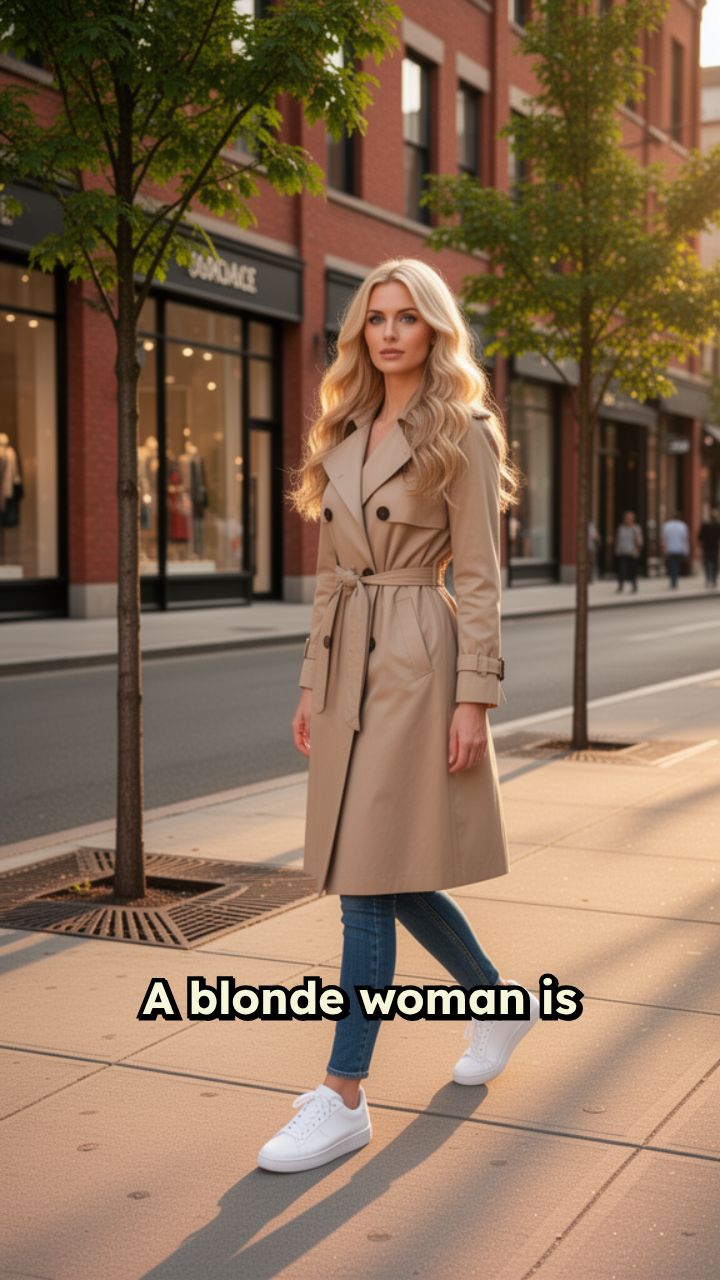 A blonde woman is walking down the street. She meets a man and steals his bag.