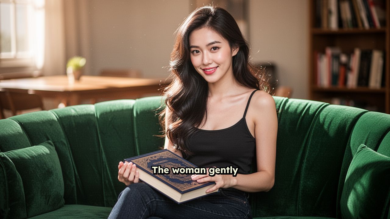 The woman gently closes the book in her hands, looks up and smiles warmly at the camera.
