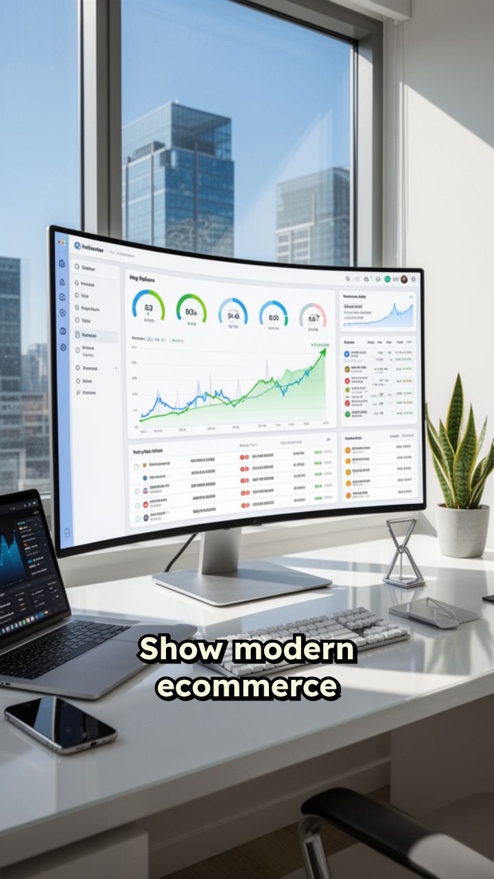 Show modern ecommerce visuals: Walmart dashboard screens, online orders, product packaging,