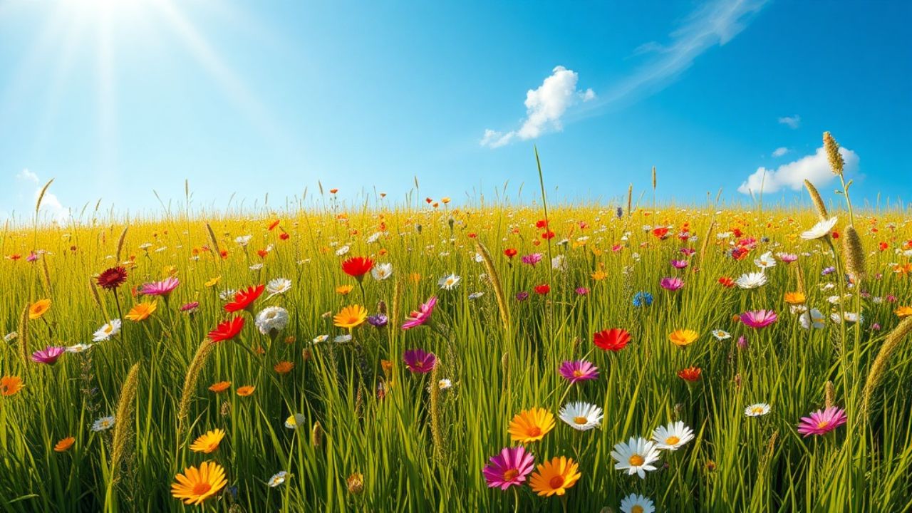 Nel prato fiorito, sotto il cielo blu, c'è un ronzio gentile che arriva