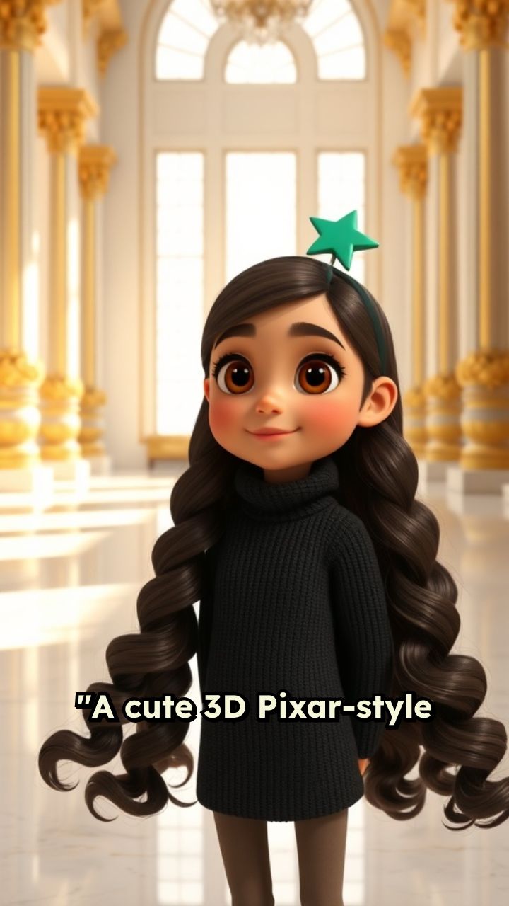 "A cute 3D Pixar-style cartoon of a young girl named Amira with long wavy brown hair,