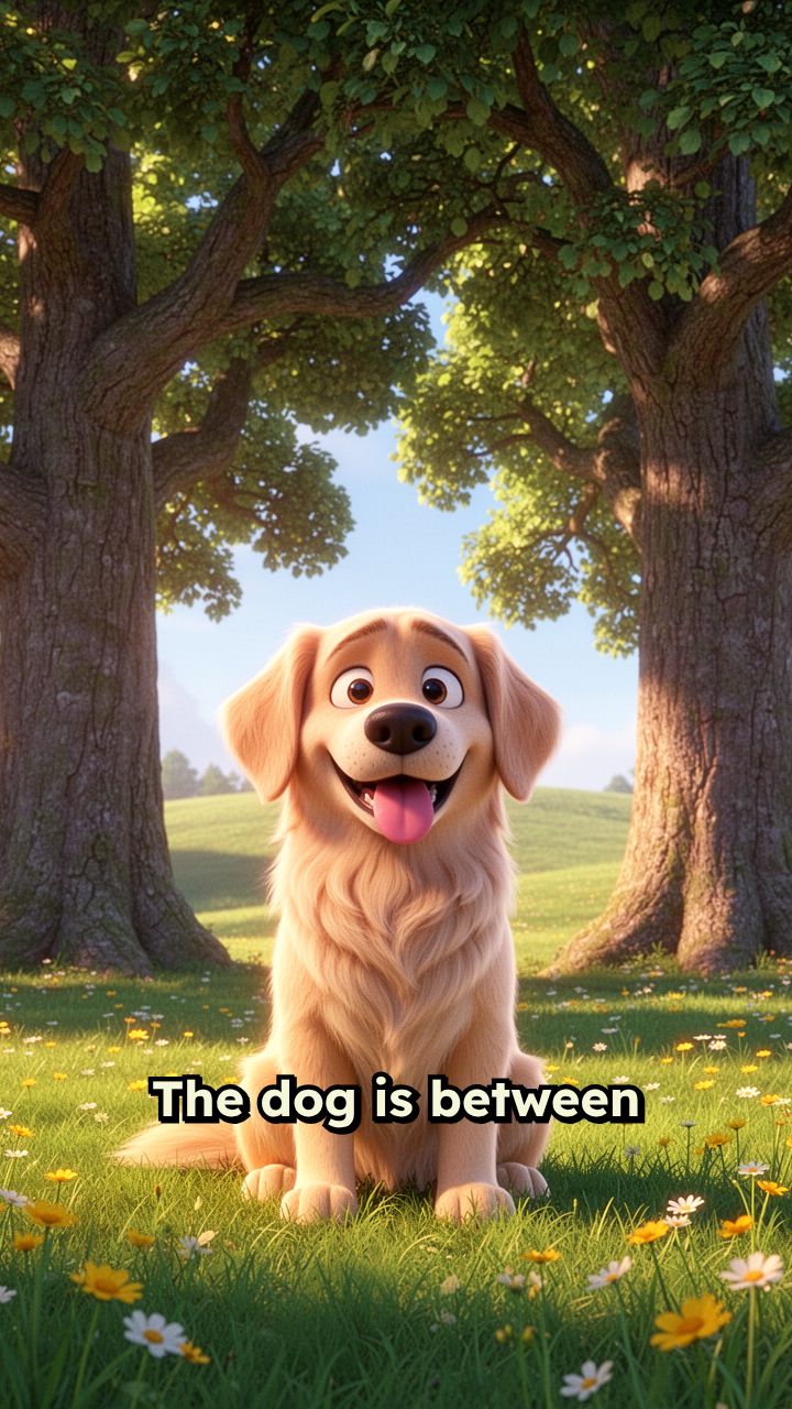 The dog is between the trees. The cat is between the chairs. The bird is between
