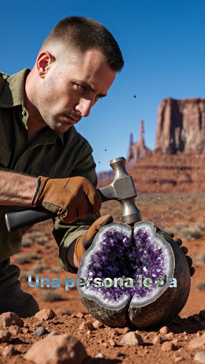 Una persona le da con martillo a roca dos veces la abre con sus manos y aparece amatista