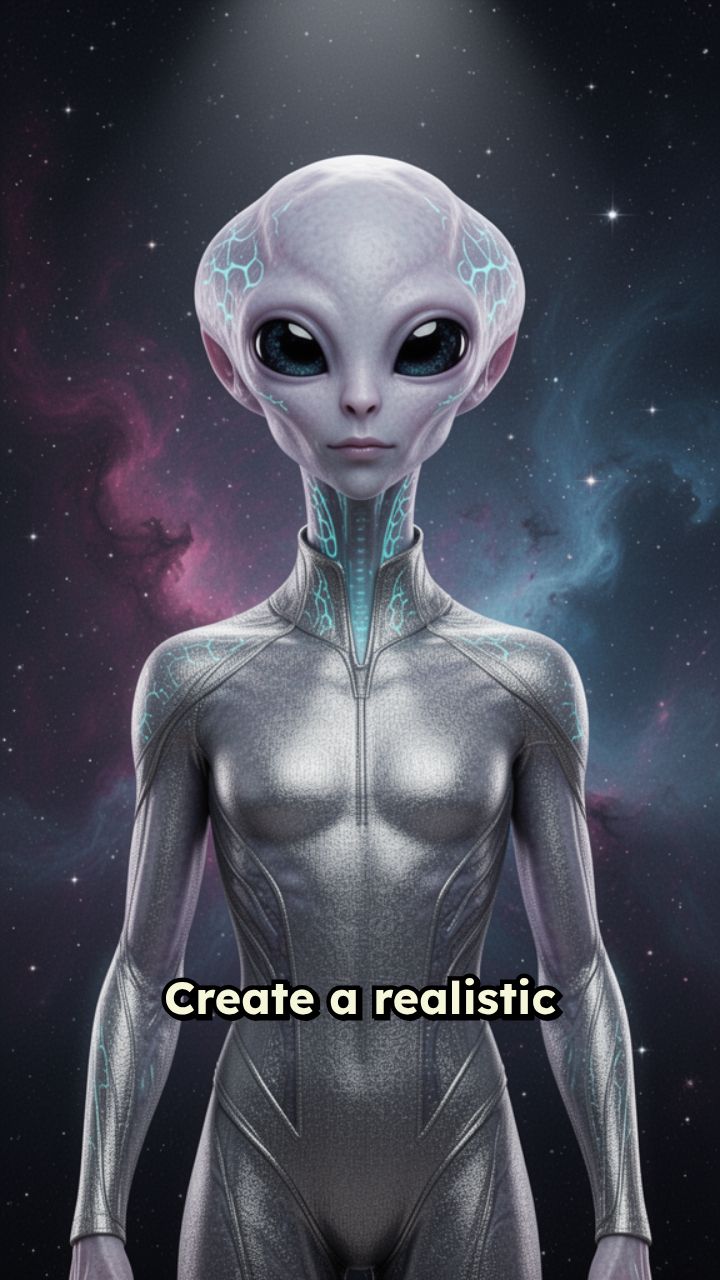 Create a realistic but friendly extraterrestrial humanoid standing still against a dark,