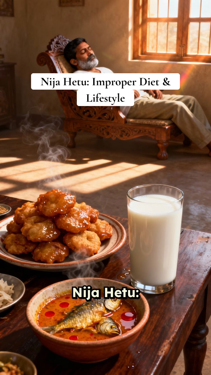 Nija Hetu: improper diet and an unhealthy daily lifestyle. Abhighataja: