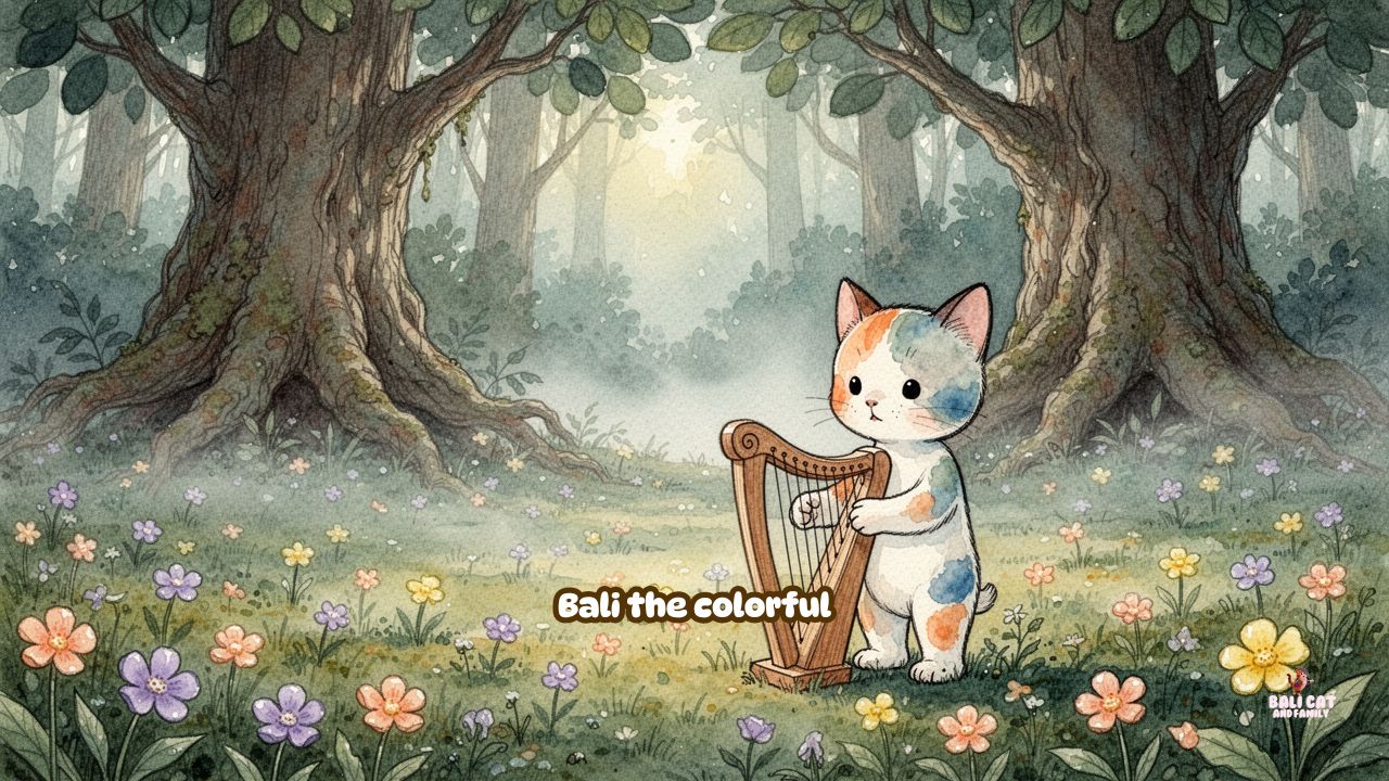 Bali the colorful baby kitty, plays the arp in the forest, surrounded by beautiful