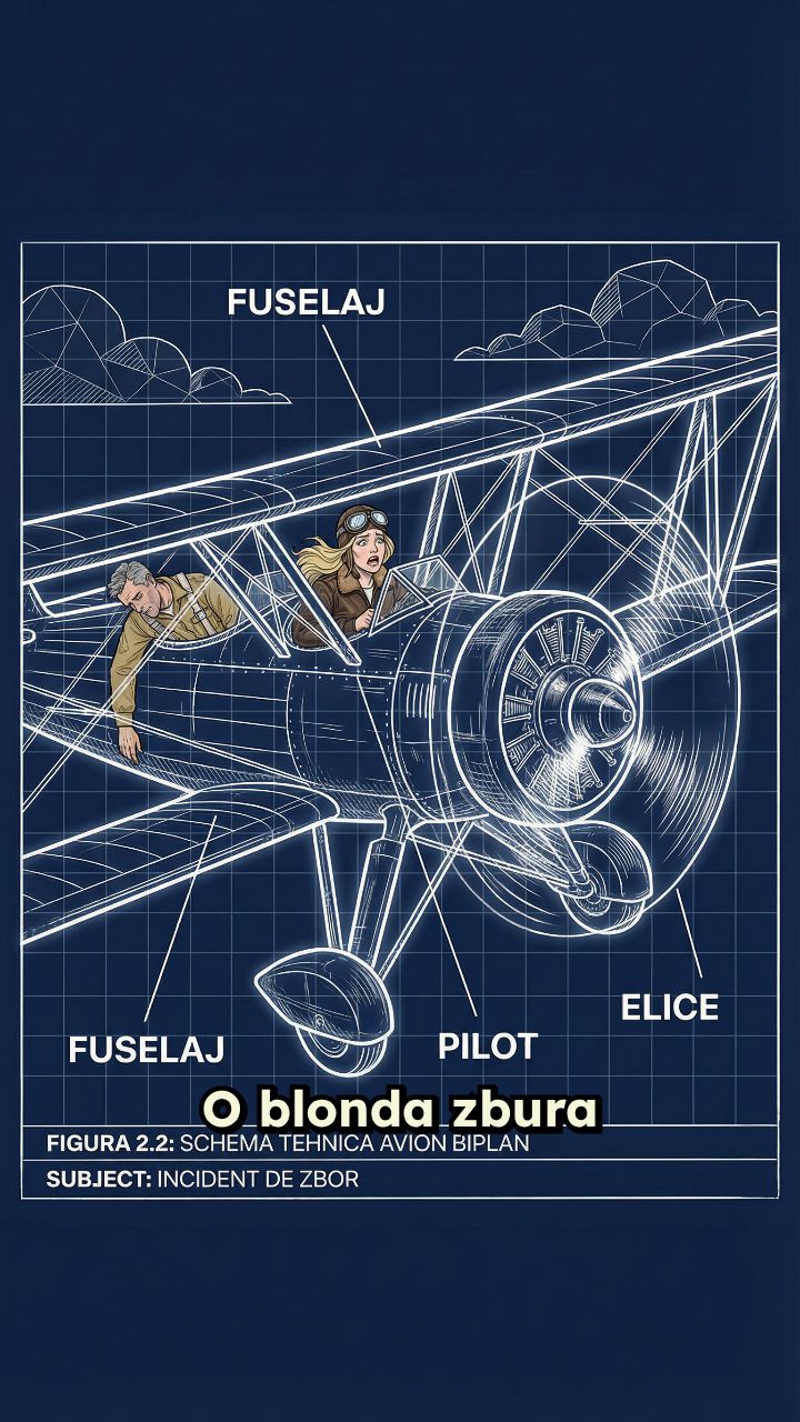 O blonda zbura intr-un avion biplan de doua locuri. La un moment dat pilotul are