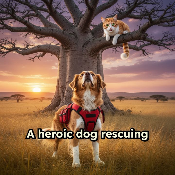 A heroic dog rescuing a cat stuck high in a massive baobab tree in the African savannah.