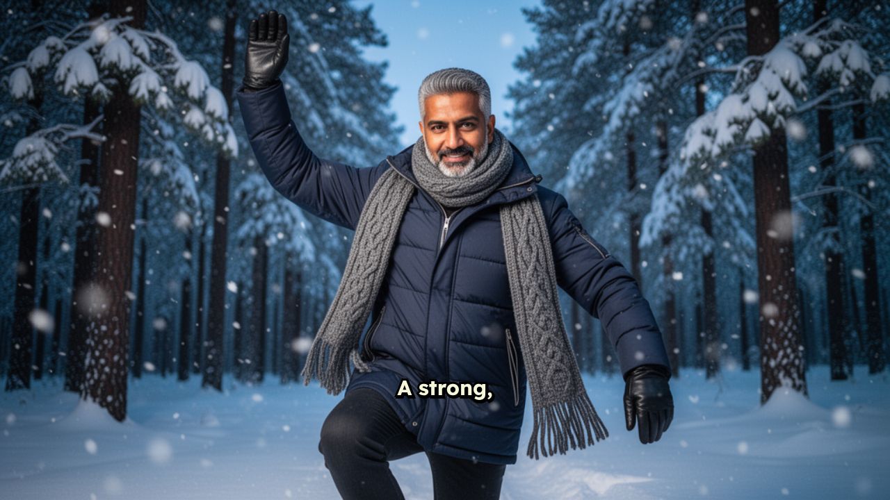 him, with realistic depth and wind interaction. He wears a dark insulated winter