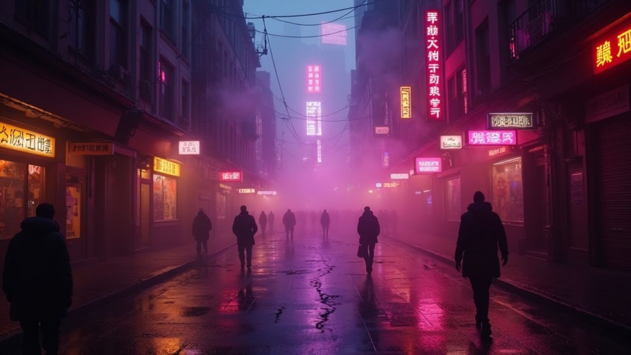 Neon lights sh-shinin' bright. Crowds are moving through the night. Smiles and laughter,