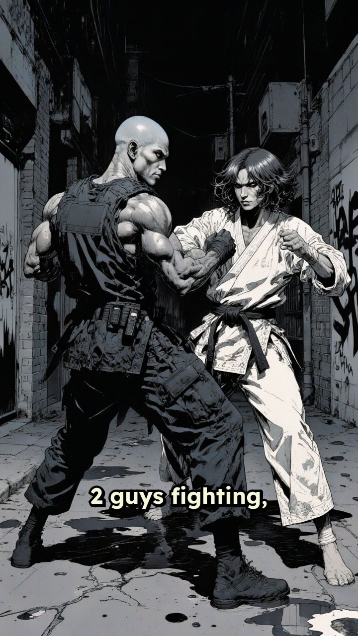 2 guys fighting, one guy is black and has shaved head with blue eyes, the other guy is