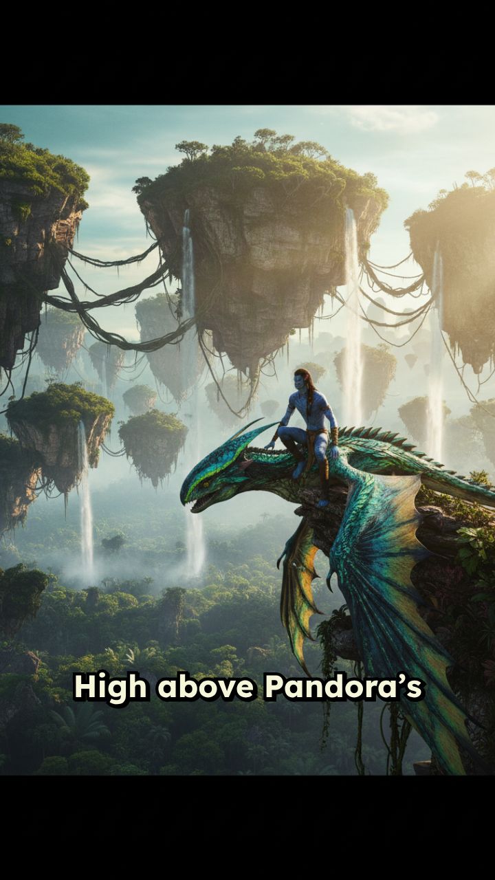 High above Pandora’s floating mountains, an Avatar bonds with an Ikran, soaring through
