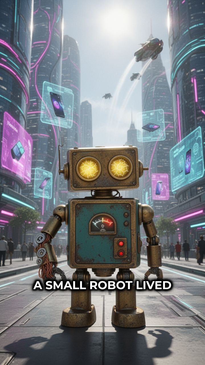 the city lost power. All the advanced robots shut down. The small robot kept walking.