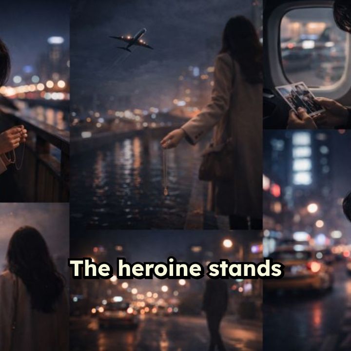 the aircraft cuts through the clouds. On the bridge, the heroine looks up and watches a