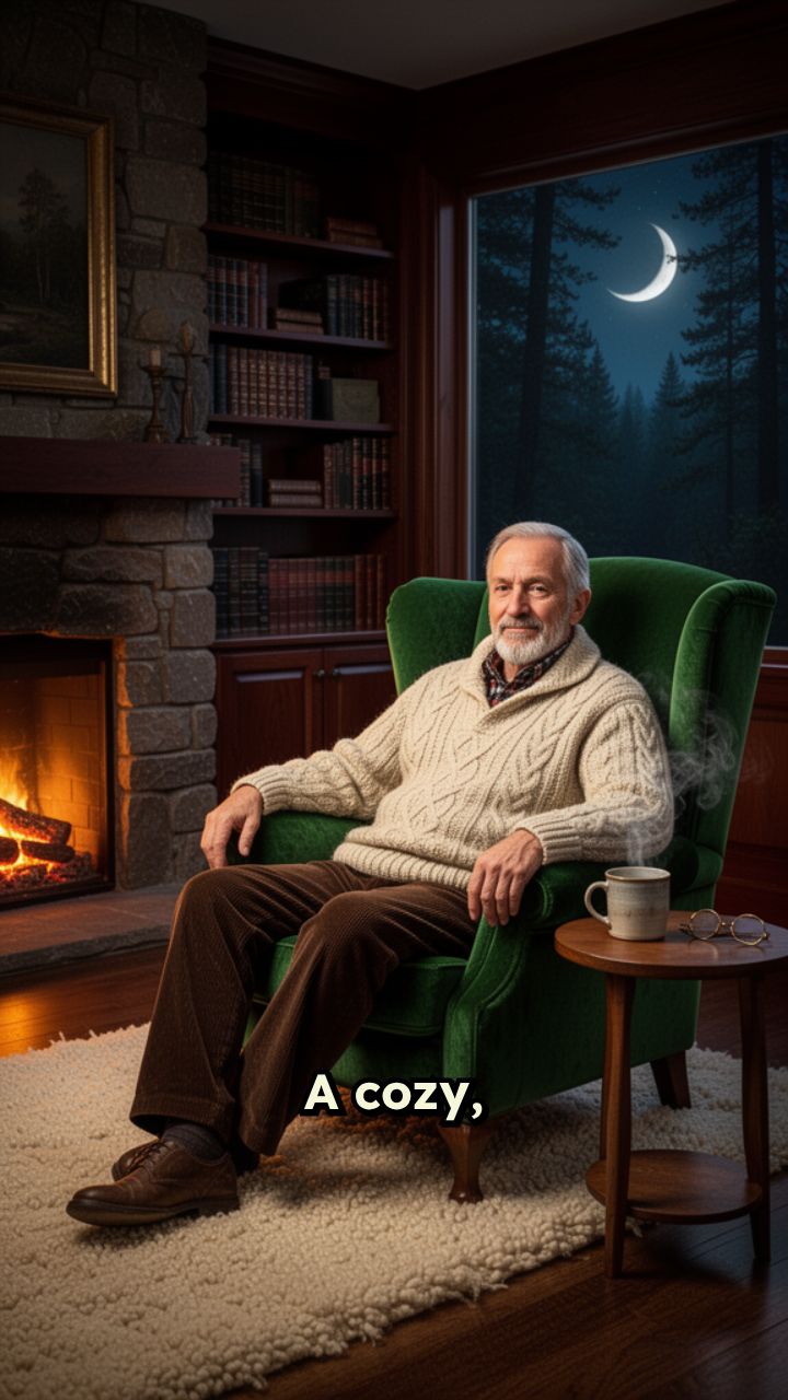 A cozy, dimly lit living room ambience. Soft lighting, distant home sounds