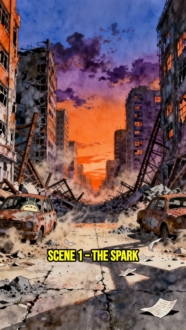 SCENE 1 – THE SPARK Ruined city street at dusk. Wind pushes dust and ash across cracked