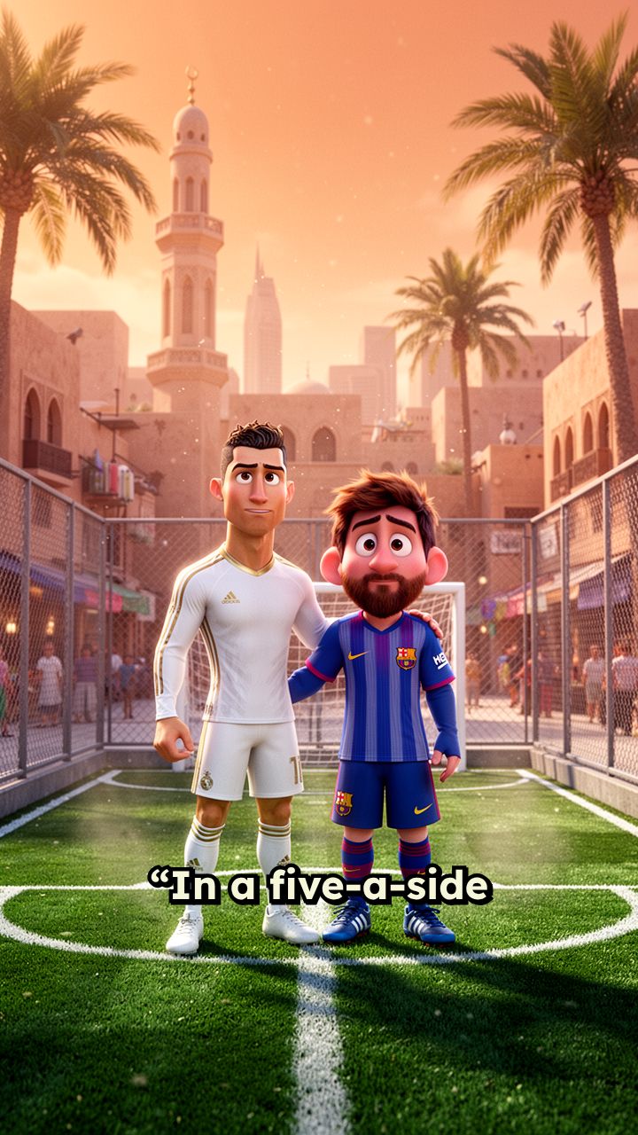 “In a five-a-side football field in an Arab city, Cristiano and Messi are standing next
