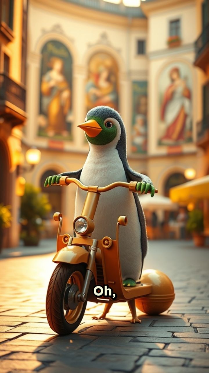 Oh, guarda il Cucupinguino! Che cosa sta facendo adesso? La sua motorette