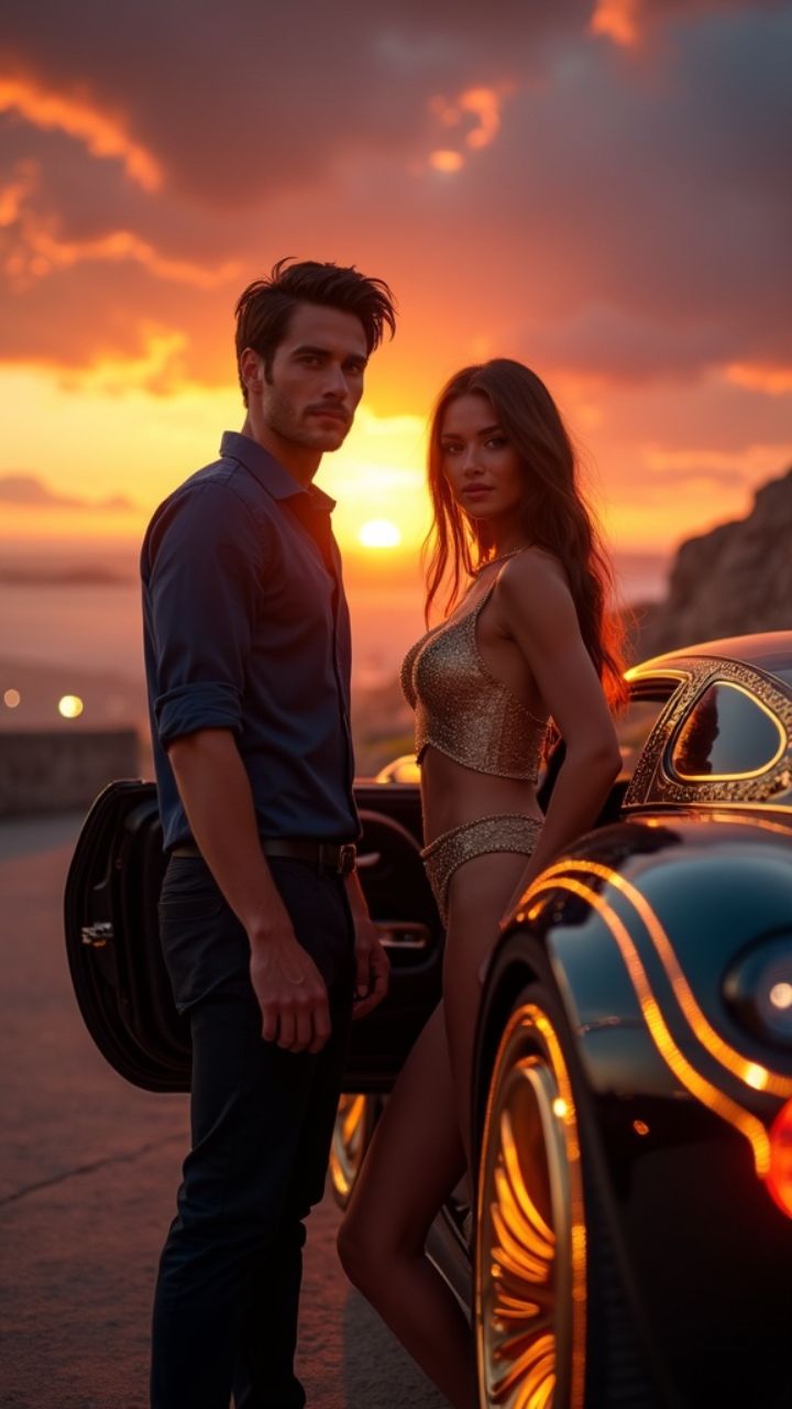 <<Picked her up at sunset. Golden light on her skin. She wore a