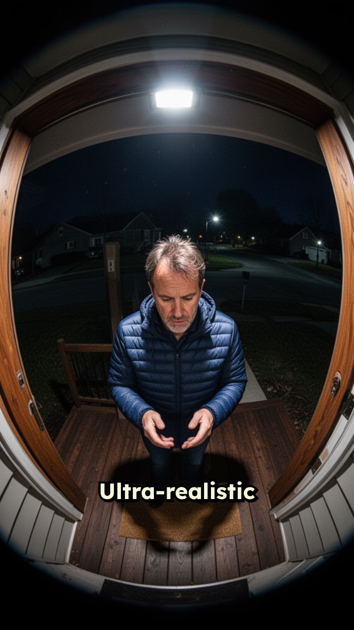 Ultra-realistic doorbell camera footage, extreme fisheye lens,