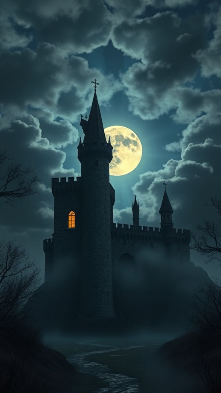 The castle door groans like a movie set. Moon on the moat,