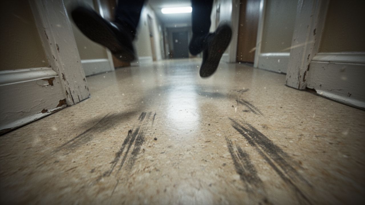 Shaky handheld footage as if the camera is suddenly dropped to the floor. The image jerks