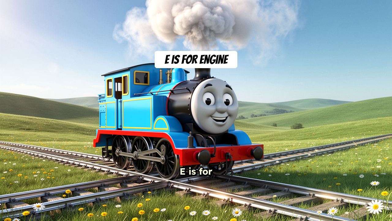E is for Engine. This blue train is starting its journey today.