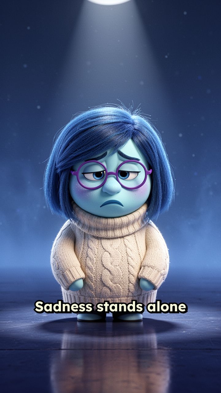 Sadness stands alone in soft blue lighting, slumped sadly, looking down. "Haven’t registered