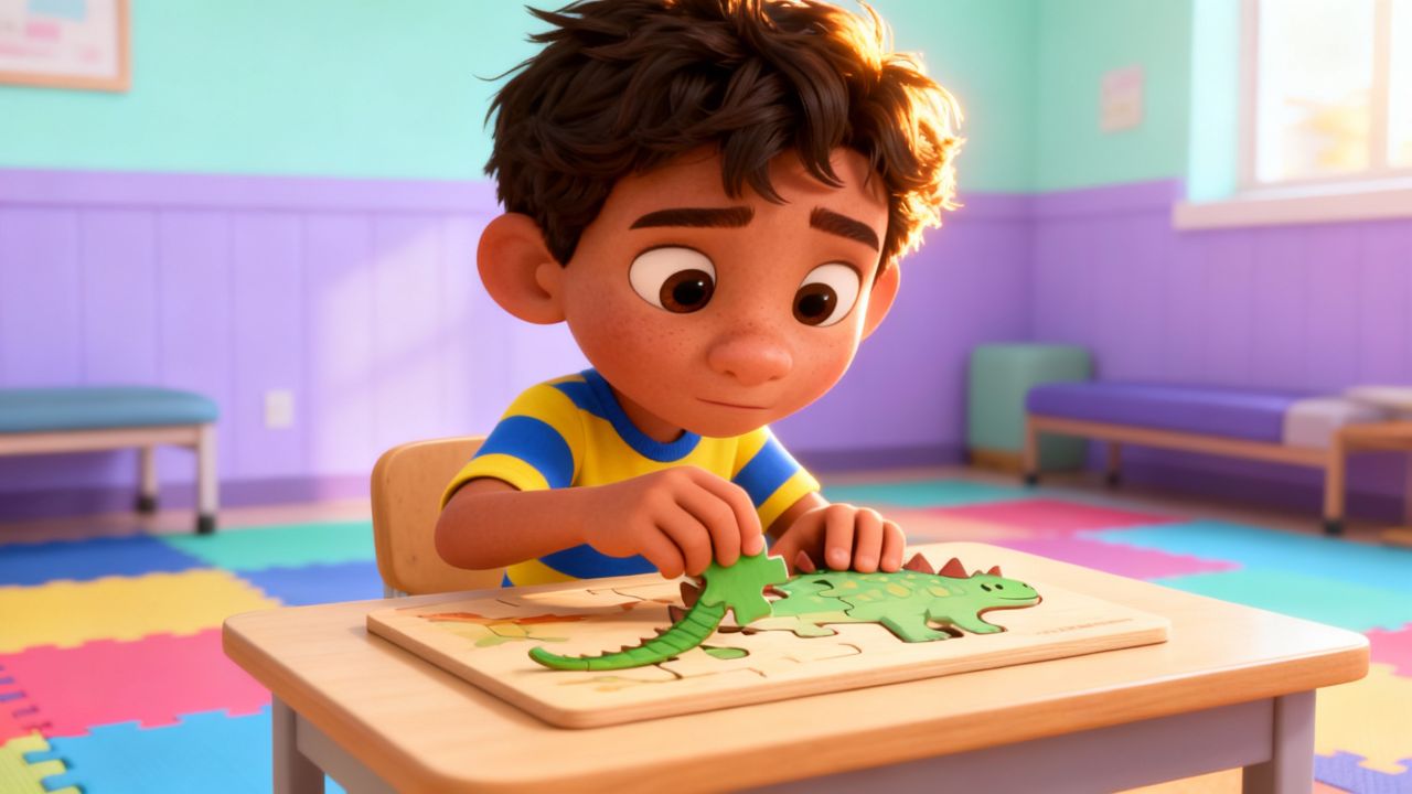 Mateo está concentrado y termina su rompecabezas con mucha calma. Buen trabajo,