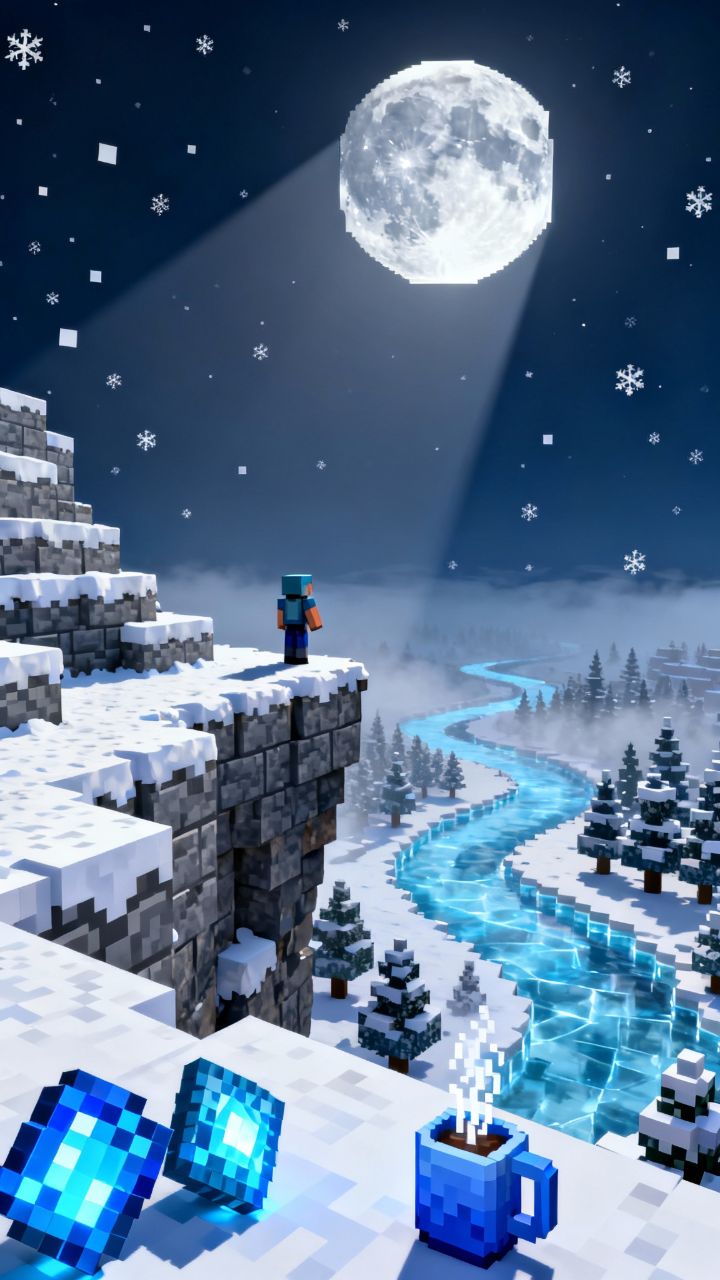 Moon shining bright. Steve found a ledge on Christmas night. Hot cocoa dreams,
