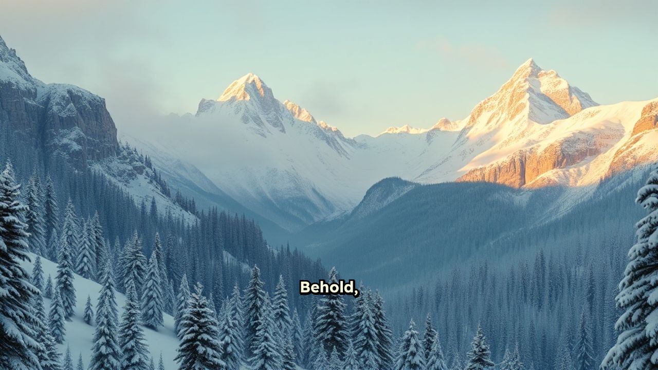 Behold, a majestic winter landscape unfolds before us. Towering,