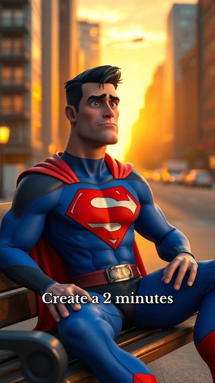 Create a 2 minutes cinematic vertical video about a jobless superhero inspired by Superman (original