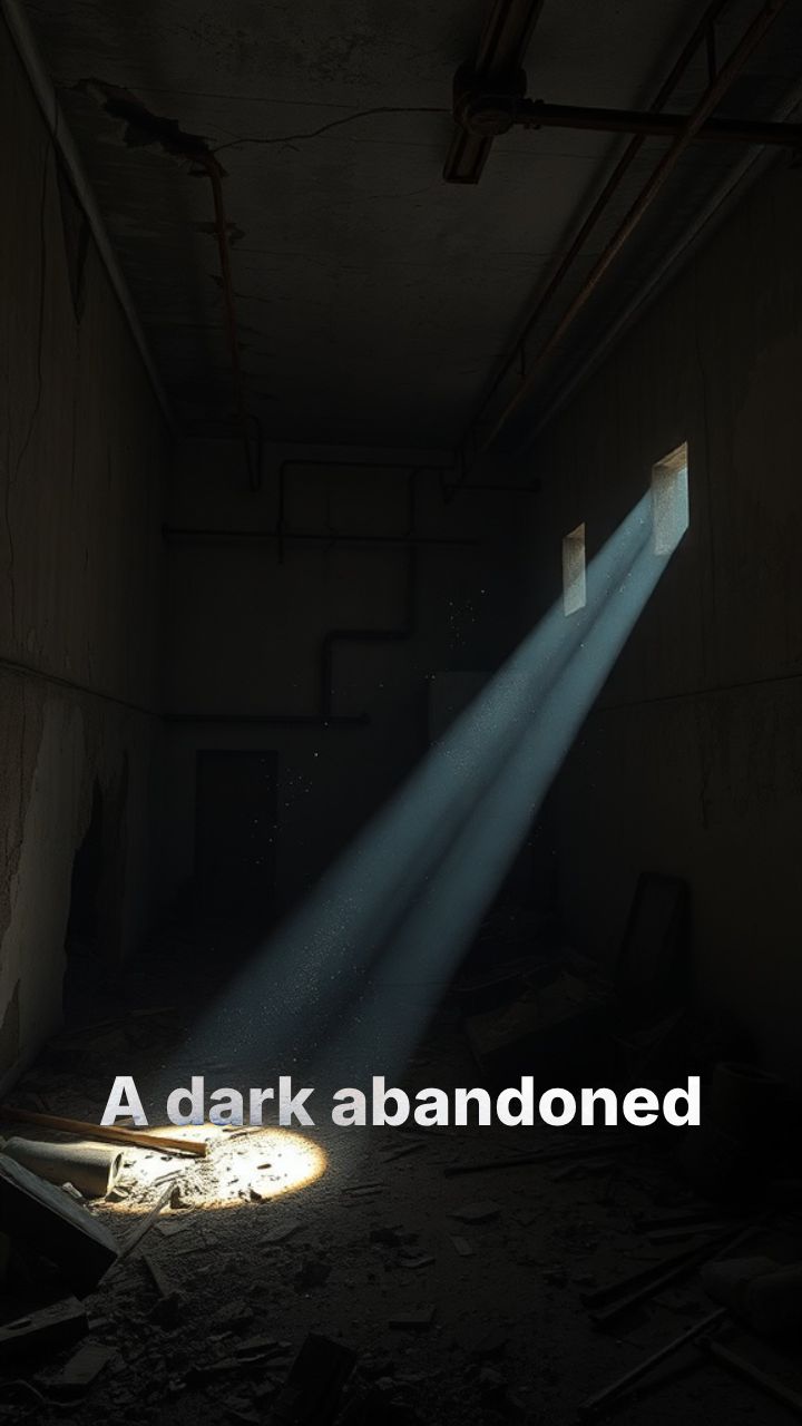 A dark abandoned room, illuminated only by a flickering phone flashlight.