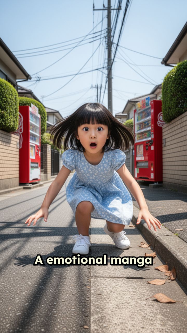 A emotional manga story sequence: a young girl running down the street suddenly trips and