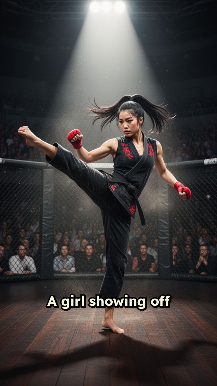 A girl showing off her martial arts skills in fighting arena.