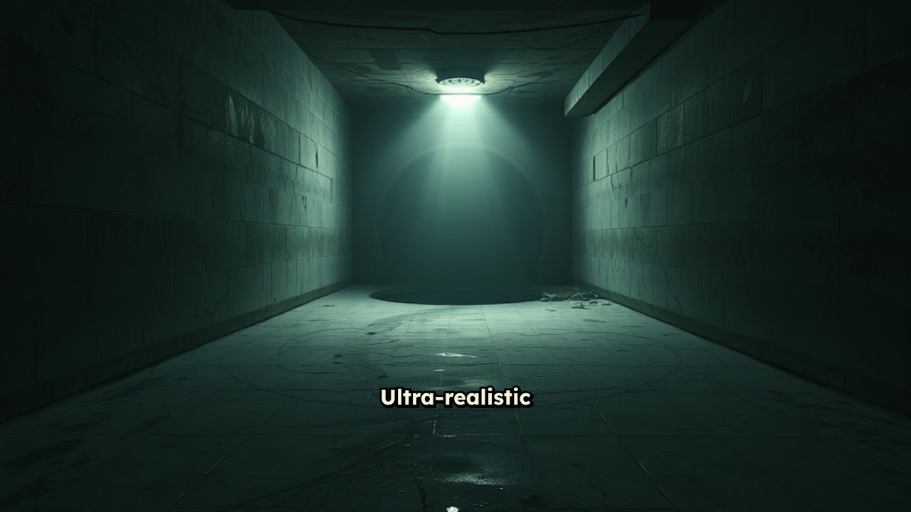 Ultra-realistic scene depicting the interior of a basement. The basement has